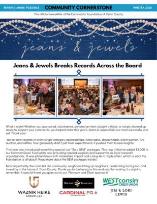 The Community Foundation of Dunn County hosted its annual Jeans & Jewels Gala on Saturday, November 1st at the UW–Stout Memorial Student Center, welcoming 300 guests for an evening of philanthropy and celebration. The event was generously supported by Platinum...