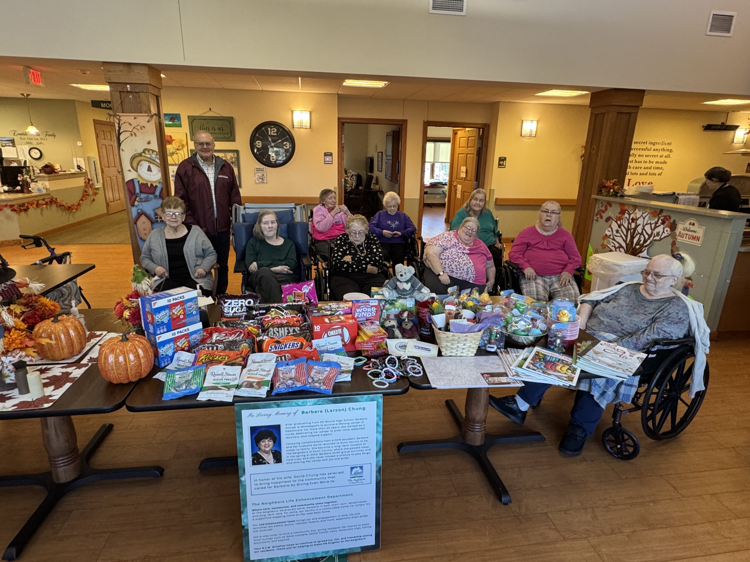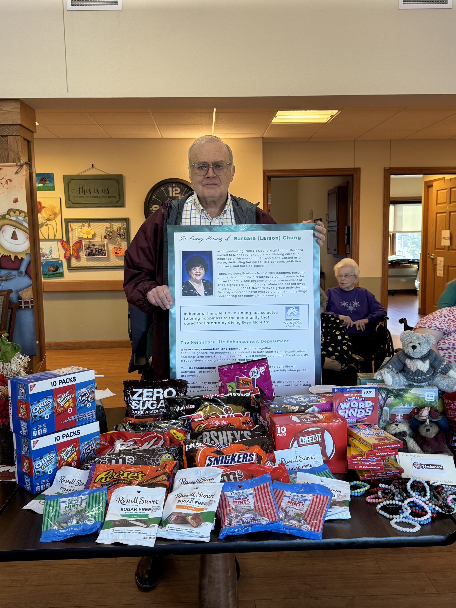 The Neighbors’ GEM package was donated by David Chung in loving memory of his wife, Barbara, whose warmth and compassion touched many lives. The package was filled with candy and snacks, art supplies, holiday ornaments, bead bracelets, and fun prizes for residents to enjoy during their favorite activity — BINGO!